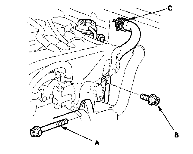 17. 2000-2005 models: Remove the upper starter motor mounting bolt (A) and upper intake manifold bracket mounting bolt (B). Disconnect the hose (C) from the suction valve.