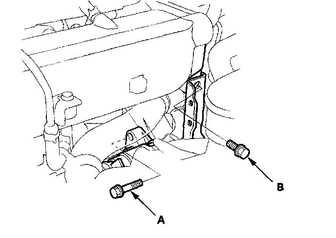 18. 2006 model: Remove the upper starter motor mounting bolt (A) and upper intake manifold bracket mounting bolt (B).