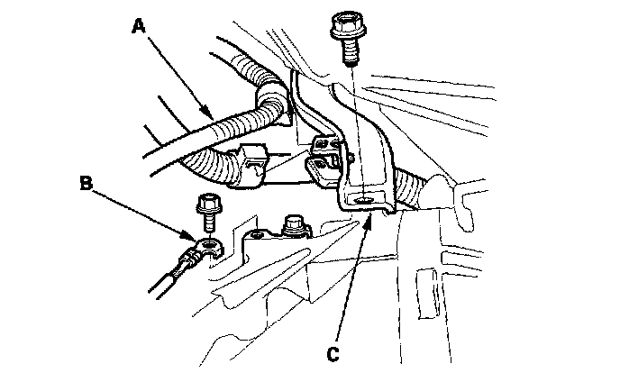 26. Remove the wire harness (A), ground cable (B), and lower intake manifold bracket mounting bolt, then remove the intake manifold bracket (C).