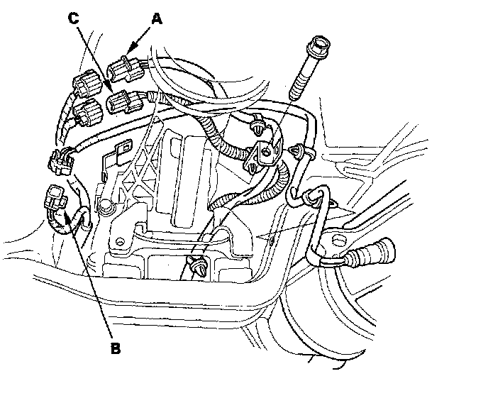 27. Disconnect the primary heated oxygen sensor (primary HO2S) (sensor 1) (2000-2005 models), the air fuel ratio (A/F) sensor (sensor 1) (2006 model) (A), secondary heated oxygen sensor (secondary HO2S) (sensor 2) (B), and the back-up light switch (C) connectors, then remove the wire harness from the transmission.