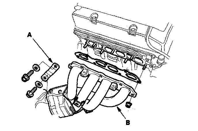 29. Remove the exhaust manifold bracket (A) and the exhaust manifold (B).