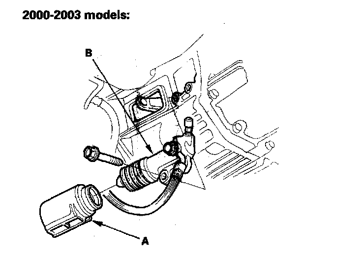 32. Remove the release fork boot (A), then carefully remove the slave cylinder (B). Do not press the clutch pedal once the slave cylinder has been removed.
