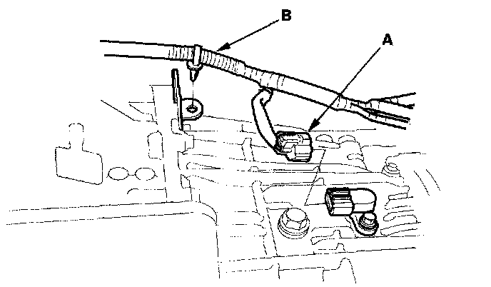 40. Lower the transmission. Disconnect the vehicle speed sensor (VSS) (2000-2005 models) or the output shaft (countershaft) speed sensor (2006 model) connector (A), then remove the wire harness (B) from the transmission.