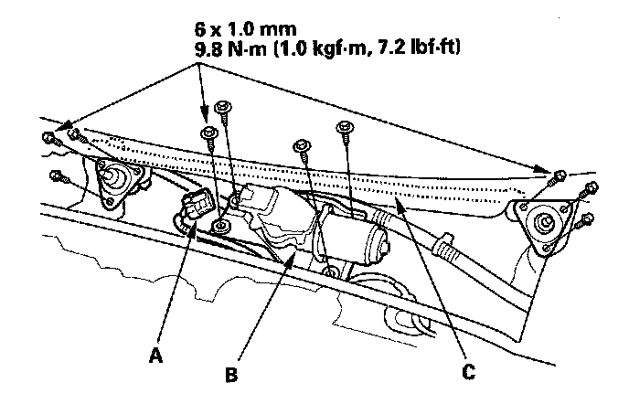 4. Remove the bolts, then remove windshield wiper linkage assembly (C).