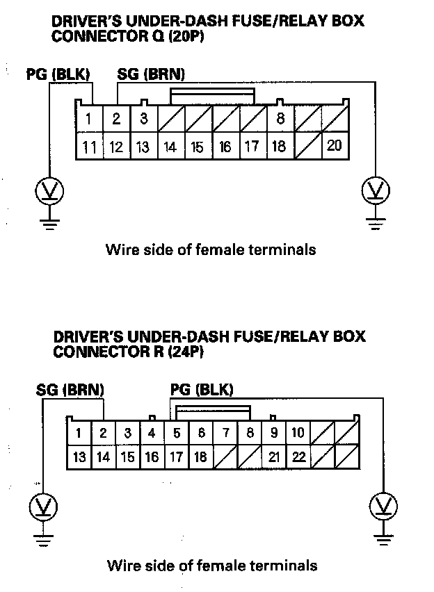 8. Measure voltage between body ground and the driver's under-dash fuse/relay box connector Q (20P) No. 1 and No. 2 terminals, and between body ground and the connector R (24P) No. 2 and No. 5 terminals individually.