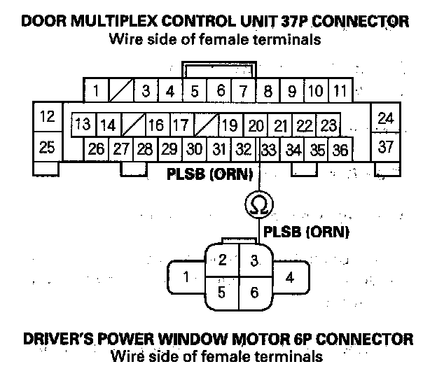 11. Check for continuity between the door multiplex control unit 37P connector No. 20 terminal and the driver's power window motor 6P connector No. 3 terminal.