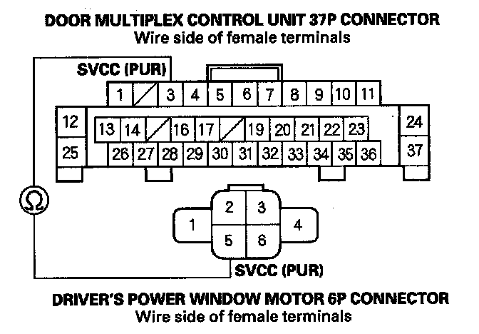 15. Check for continuity between the door multiplex control unit 37P connector No. 3 terminal and the driver's power window motor 6P connector No. 5 terminal.