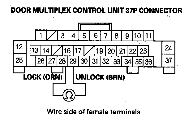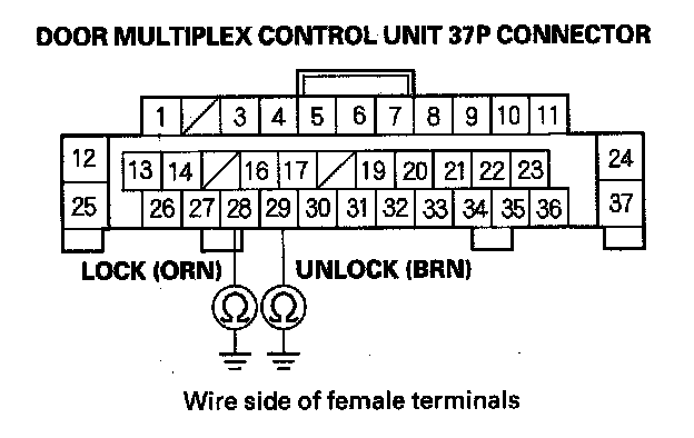11. Check for continuity between body ground and the door multiplex control unit 37P connector No. 28 and No. 29 terminals.