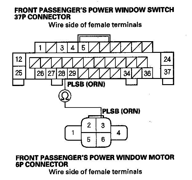 11. Check for continuity between the front passenger's power window switch 37P connector No. 28 terminal and the front passenger's power window motor 6P connector No. 3 terminal.