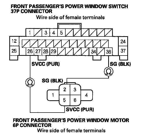 14. Check for continuity between the front passenger's power window switch 37P connector No. 26 and No. 36 terminals and the front passenger's power window motor 6P connector No. 5 and No. 2 terminals respectively.