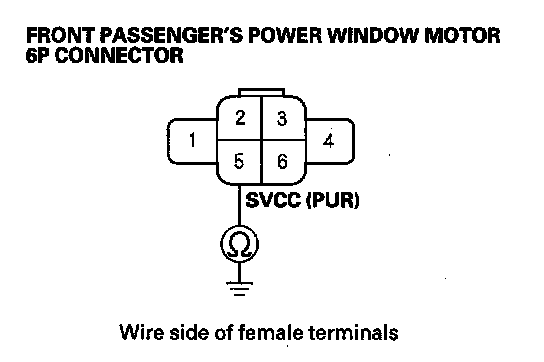 12. Check for continuity between the front passenger's power window motor 6P connector No. 3 terminal and body ground.