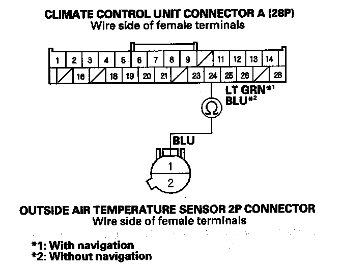 8. Check for continuity between climate control unit connector A (28P) No. 24 terminal and the outside air temperature sensor 2P connector No. 1 terminal.