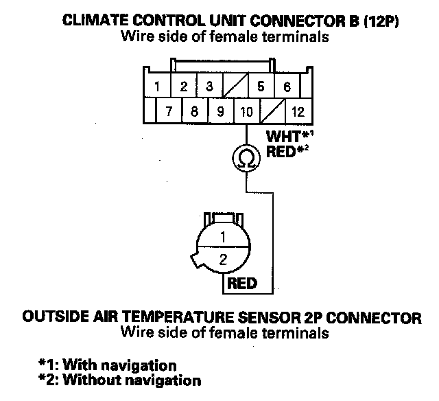 9. Check for continuity between climate control unit connector B (12P) No. 10 terminal and the outside air temperature sensor 2P connector No. 2 terminal.