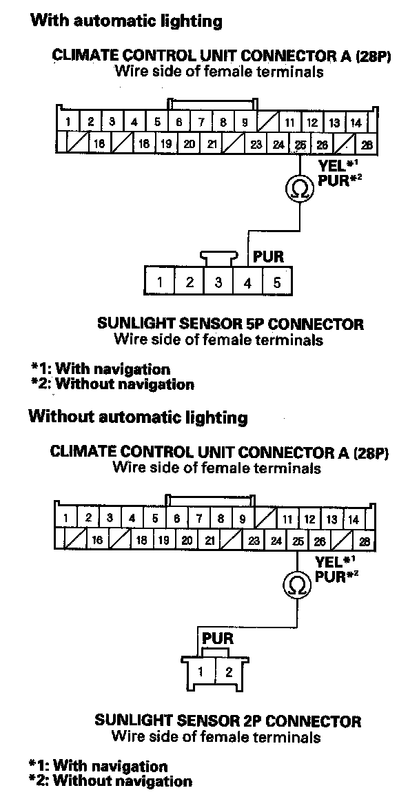 8. Check for continuity between climate control unit connector A (28P) No. 25 terminal and the sunlight sensor 5P connector No. 4 terminal (with automatic lighting) or the sunlight sensor 2P connector No. 1 terminal (without automatic lighting).