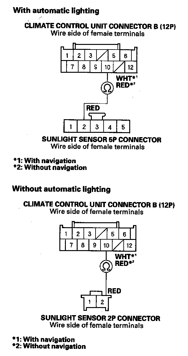 9. Check for continuity between climate control unit connector B (12P) No. 10 terminal and the sunlight sensor 5P connector No. 2 terminal (with automatic lighting) or the sunlight sensor 2P connector No. 2 terminal (without automatic lighting).
