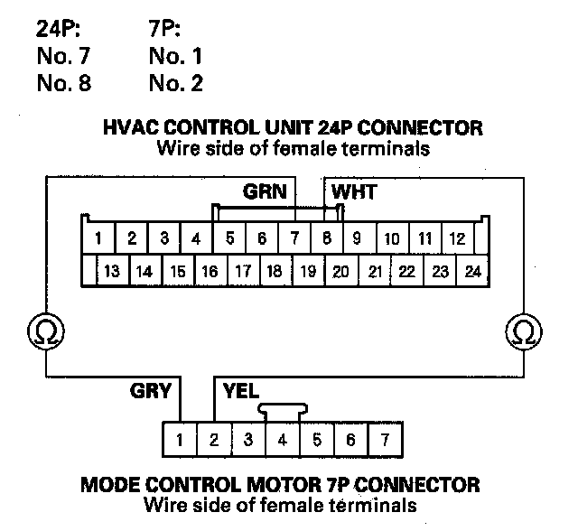 8. Check for continuity between the following terminals of the HVAC control unit 24P connector and the mode control motor 7P connector.