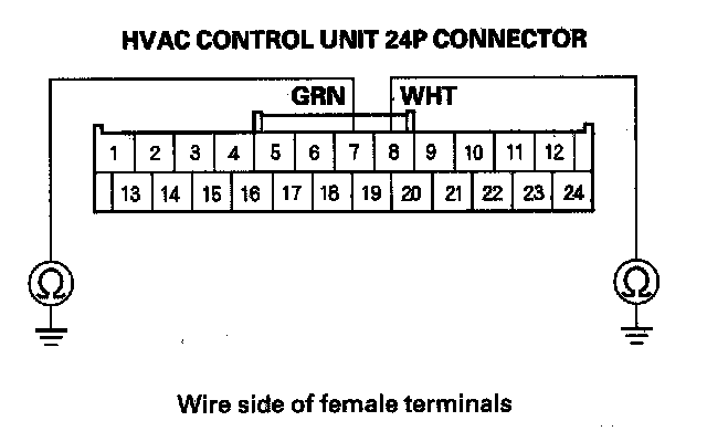 9. Check for continuity between body ground and the HVAC control unit 24P connector No. 7 and No. 8 terminals individually.