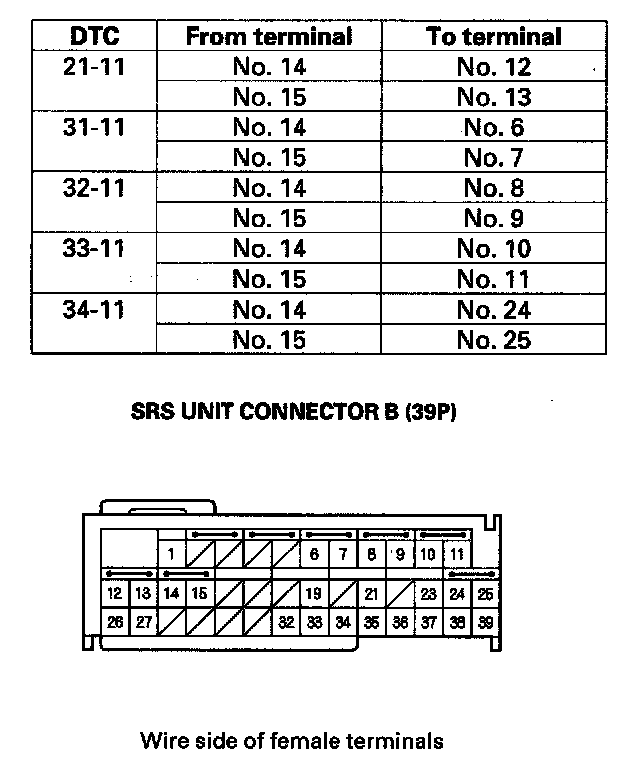 8. Check for continuity between the terminals of SRS unit connector B (39P) according to the table. There should be no continuity.