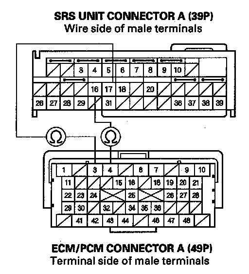 10. Check for continuity between the No. 16 terminal of SRS unit connector A (39P) and the No. 4 terminal of ECM/PCM connector A (49P), and between the No. 17 terminal of SRS unit connector A (39P) and the No. 3 terminal of the ECM/PCM connector A (49P).