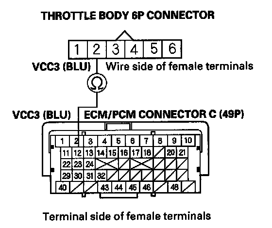 15. Check for continuity between ECM/PCM connector terminal C12 and throttle body 6P connector terminal No. 2.