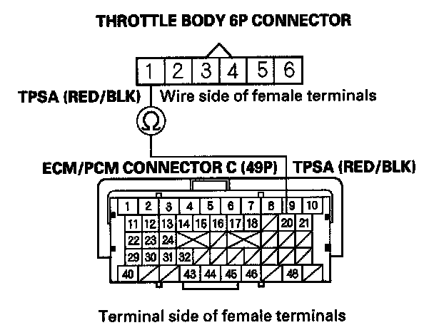12. Check for continuity between ECM/PCM connector terminal C20 and throttle body 6P connector terminal No. 1.