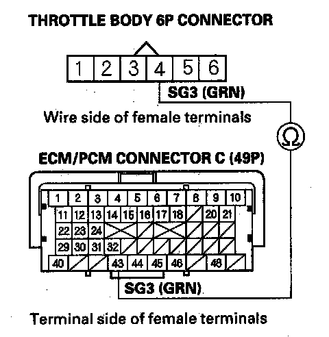 17. Check for continuity between ECM/PCM connector terminal C43 and throttle body 6P connector terminal No. 4.