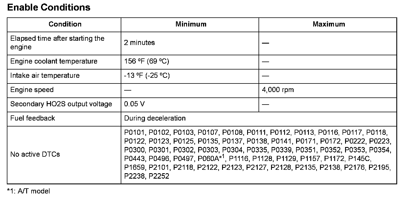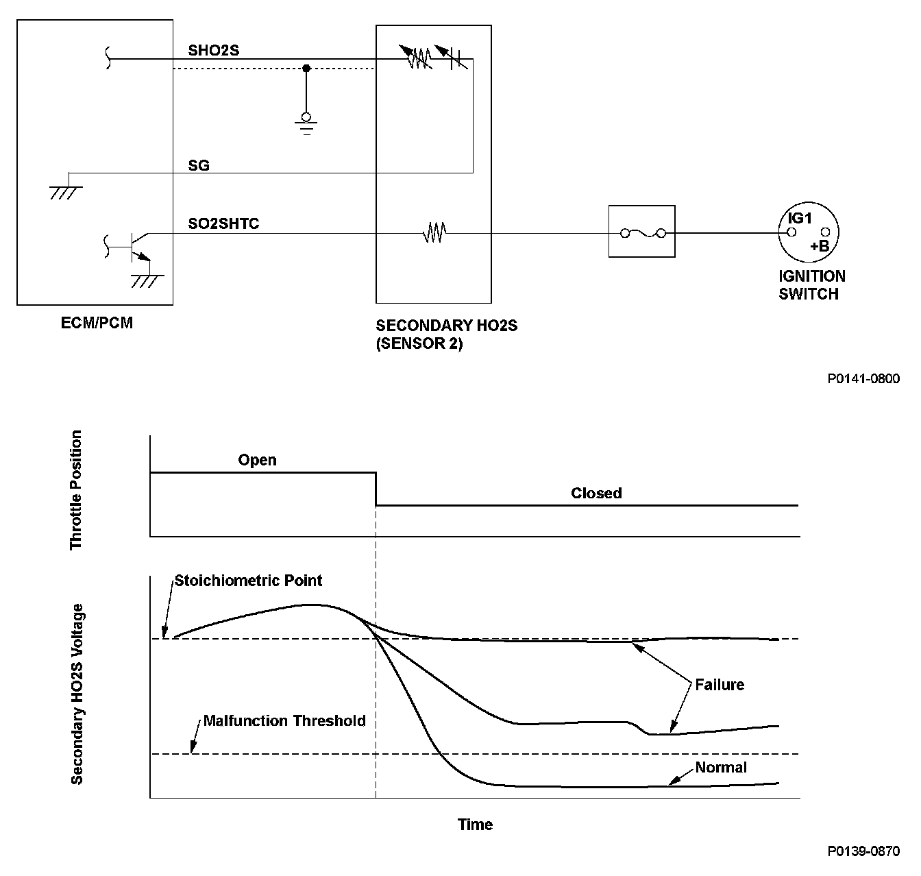 The secondary heated oxygen sensor (HO2S) (sensor 2) detects the oxygen content in the exhaust gas downstream of the three way catalytic converter (TWC) during stoichiometric air/fuel ratio feedback control. The secondary HO2S controls the air/fuel ratio with the A/F sensor output voltage to optimize TWC efficiency. When the secondary HO2S does not change during lean A/F when the throttle is closed, after full current is applied to the secondary HO2S heater, and output remains within the specified range continuously, a malfunction is detected.