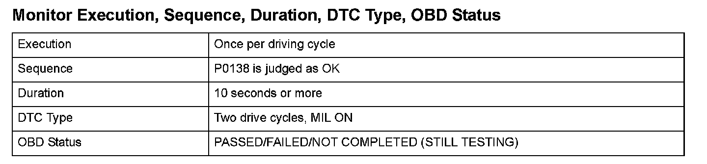 Monitor Execution, Sequence, Duration, DTC Type, OBD Status