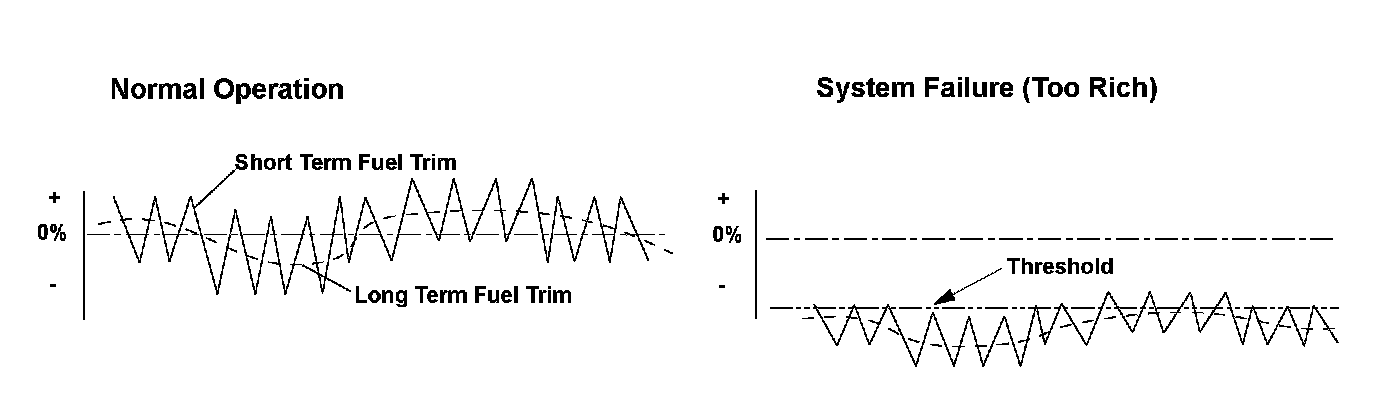 The engine control module (ECM)/powertrain control module (PCM) detects the oxygen content in the exhaust gas from the air/fuel ratio (A/F) sensor (sensor 1) signal voltage, and it uses fuel feedback control to maintain the optimal air/fuel ratio. The air/fuel ratio coefficient for correcting the amount of injected fuel is the short term fuel trim. The ECM/PCM varies short term fuel trim continuously to keep the air/fuel ratio close to the stoichiometric ratio for all driving conditions. Long term fuel trim is computed from short term fuel trim and is used to regulate long term deviation from the stoichiometric air/fuel ratio, which occurs when fuel metering components deteriorate with age or system failures occur. In addition, long term fuel trim is stored in the ECM/PCM memory and is used to determine when fuel metering components malfunction. When long term fuel trim is higher than normal, which is about 1.0 (0 %), the amount of injected fuel must be increased, and when lower than normal, it must be decreased. If long term fuel trim is lower than normal (too rich), a malfunction in the fuel metering components is detected and a DTC is stored.
