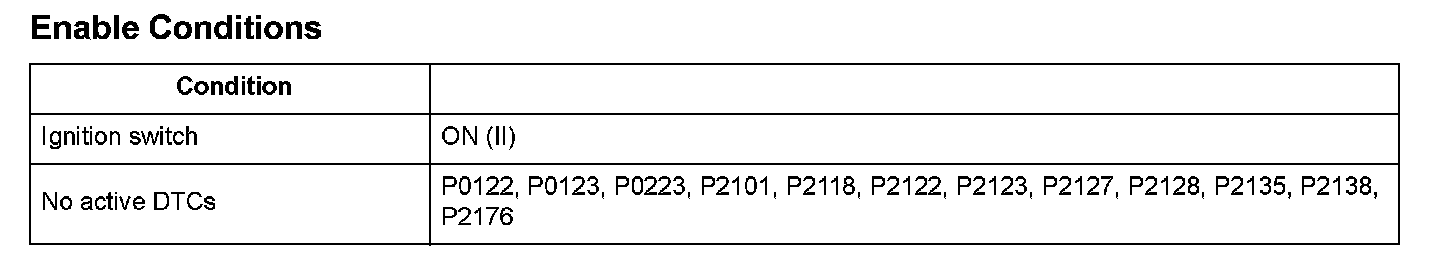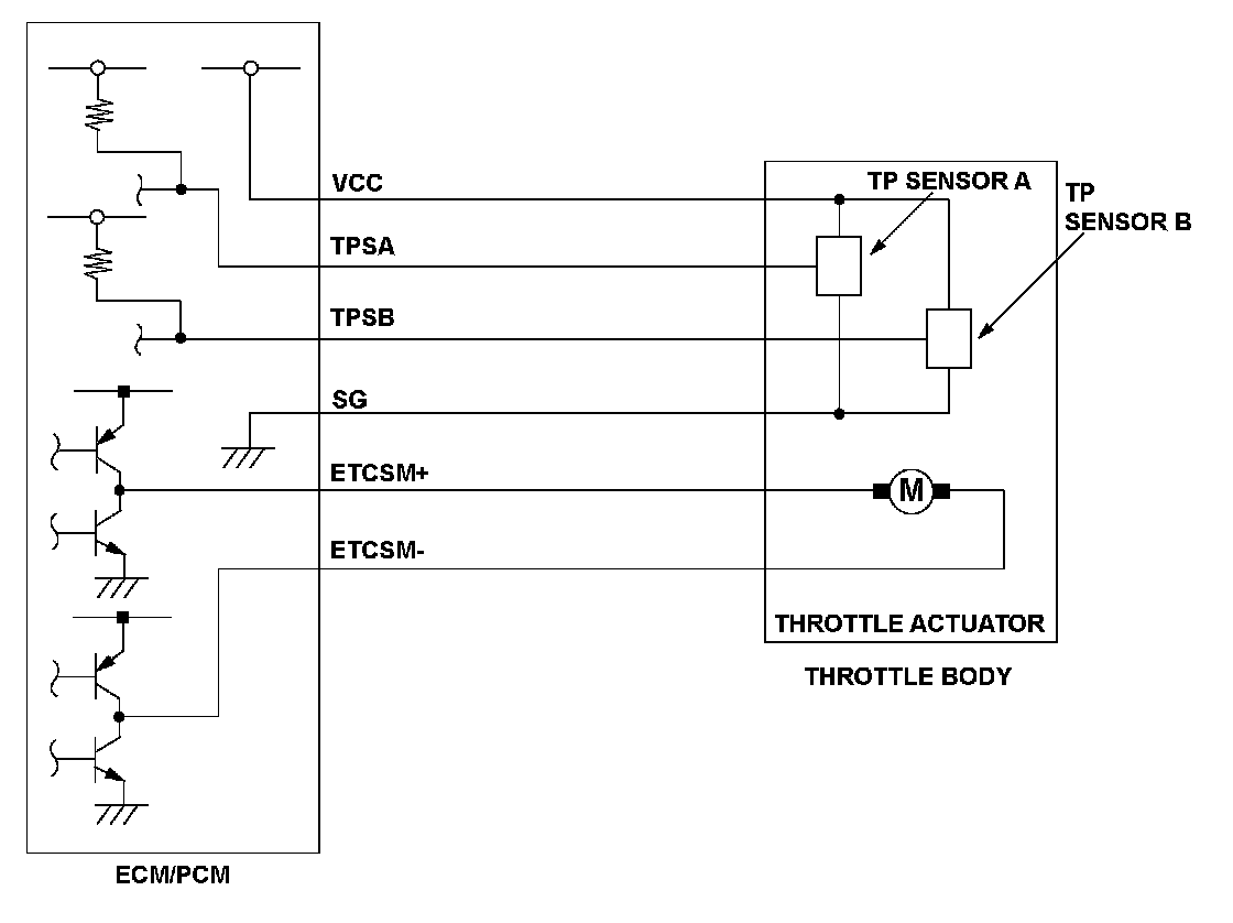 Throttle position (TP) sensor B is a semiconductor type, and it is attached to the throttle body and shaft to determine throttle valve position. The throttle valve position signal from TP sensor B is transmitted to the engine control module (ECM)/power-train control module (PCM) for target position feedback control. If the signal from TP sensor B is less than a fixed value for a set time, the ECM/PCM detects a TP sensor B malfunction and stores a DTC.