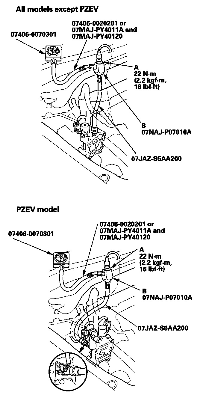 21. Attach the special tools to the rocker arm oil control valve as shown, then attach the rocker arm oil pressure switch (A) in the pressure gauge adapter (B).