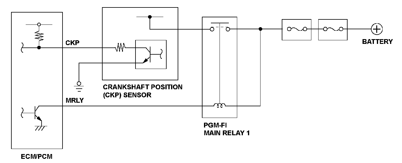 The crankshaft position (CKP) sensor consists of a rotor and a semiconductor that detects rotor position. When the engine starts, the rotor turns and the magnetic flux in the semiconductor device changes. The changes of magnetic flux are converted into pulsing signals to the engine control module (ECM)/powertrain control module (PCM). The CKP sensor detects injection/ignition timing for each cylinder and engine speed. If no pulsing signals from the CKP sensor are detected, a malfunction is detected and a DTC is stored.