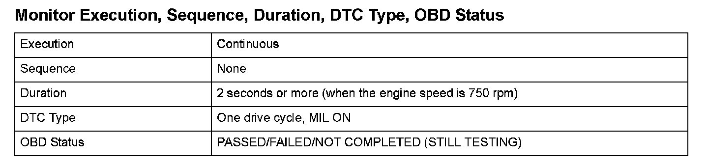 Monitor Execution, Sequence, Duration, DTC Type, OBD Status