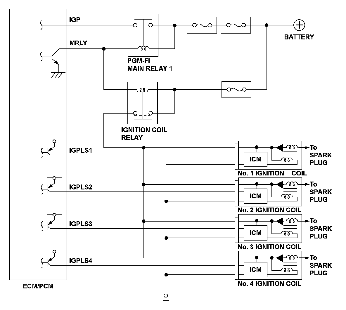 The igniter is triggered at the optimum time by the engine control module (ECM)/powertrain control module (PCM). The ECM/PCM detects a malfunction when the engine is running and the return signal does not change for a specified time or more, the ECM/PCM detects a malfunction and a DTC is stored.