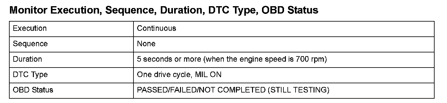 Monitor Execution, Sequence, Duration, DTC Type, OBD Status