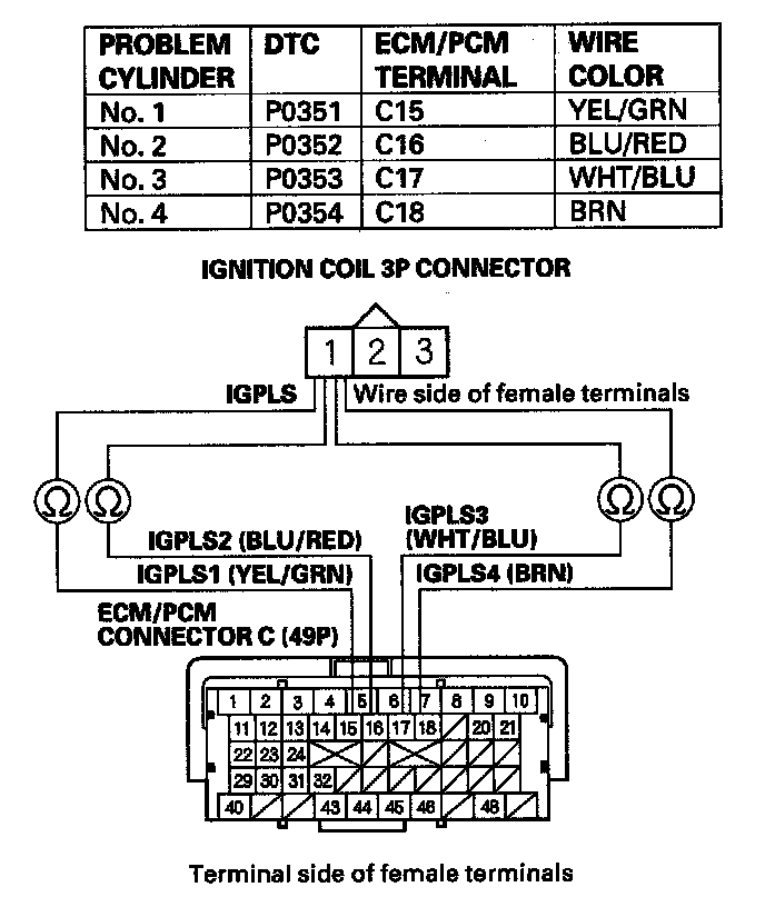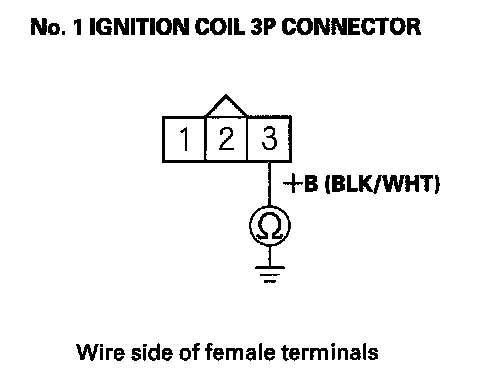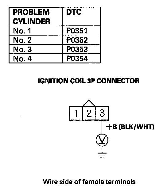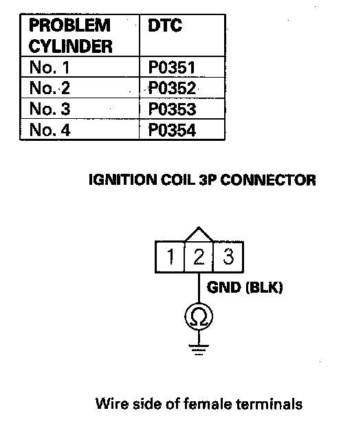 24. Check for continuity between appropriate ignition coil 3P connector terminal No. 1 and the ECM/PCM connector terminal of the problem cylinder (see table).