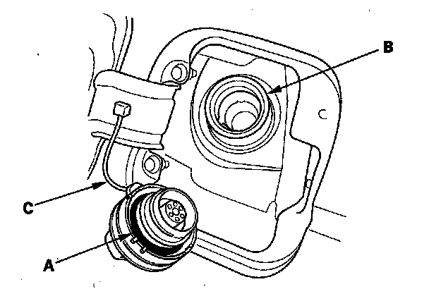 2. Check the fuel fill cap seal (A) and the fuel fill pipe mating surface (B). Verify that the fuel fill cap tether cord (C) is not caught under the cap.