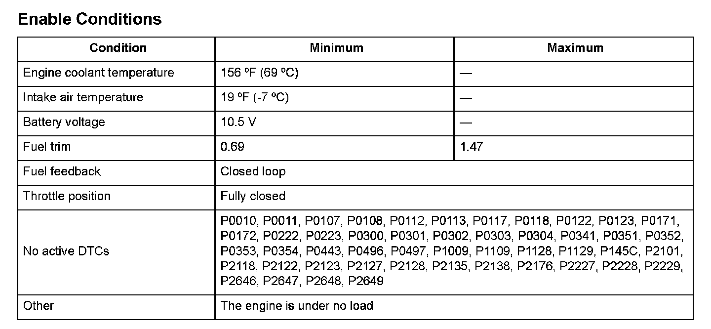 A target idle speed that meets the engine operating conditions (coolant temperature, A/C ON or OFF, etc.) is stored in the engine control module (ECM)/powertrain control module (PCM). The ECM/PCM monitors and controls the idle speed so that the actual idle speed is equal to the target idle speed. If the actual idle speed varies beyond a specified value from the target speed over a certain period of time, the ECM/PCM detects a malfunction in the idle speed control system and a DTC is stored.