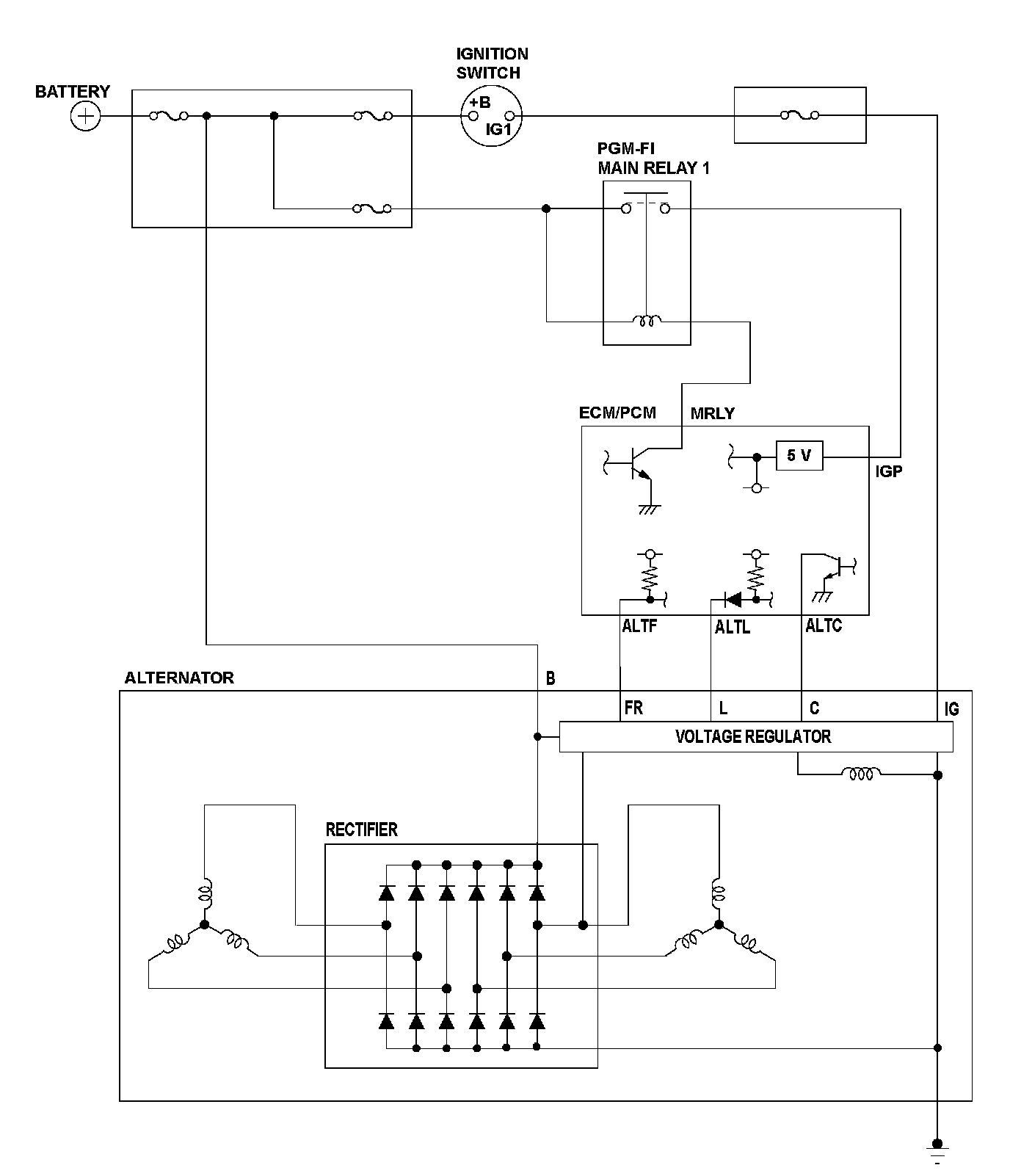 The alternator is driven by the engine, and it generates electricity to supply the necessary power to the electrical system and to charge the battery. The alternator voltage target values of 14.5 V and 12.5 V are achieved by switching the alternator control mode (controlled by the engine control module (ECM)/powertrain control module (PCM)). The alternator output signal is sent to the ECM/PCM, and it varies according to the battery's state of charge, the electrical load, and engine speed. When the IGP (power source) terminal voltage is a set value or less for a set time, the ECM/PCM detects a malfunction and a DTC is stored.