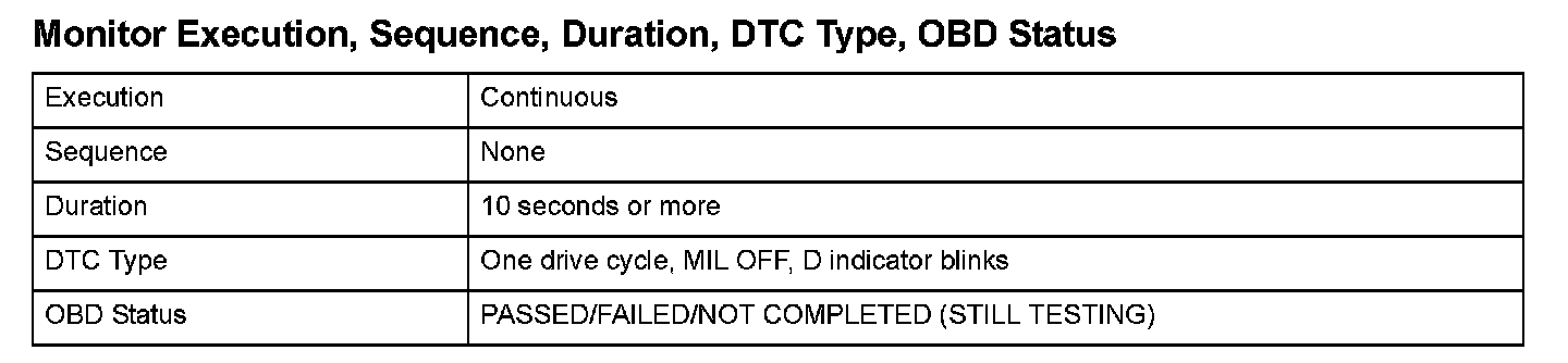 Monitor Execution, Sequence, Duration, DTC Type, OBD Status