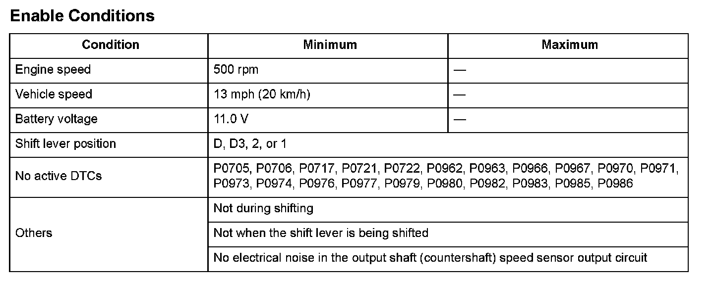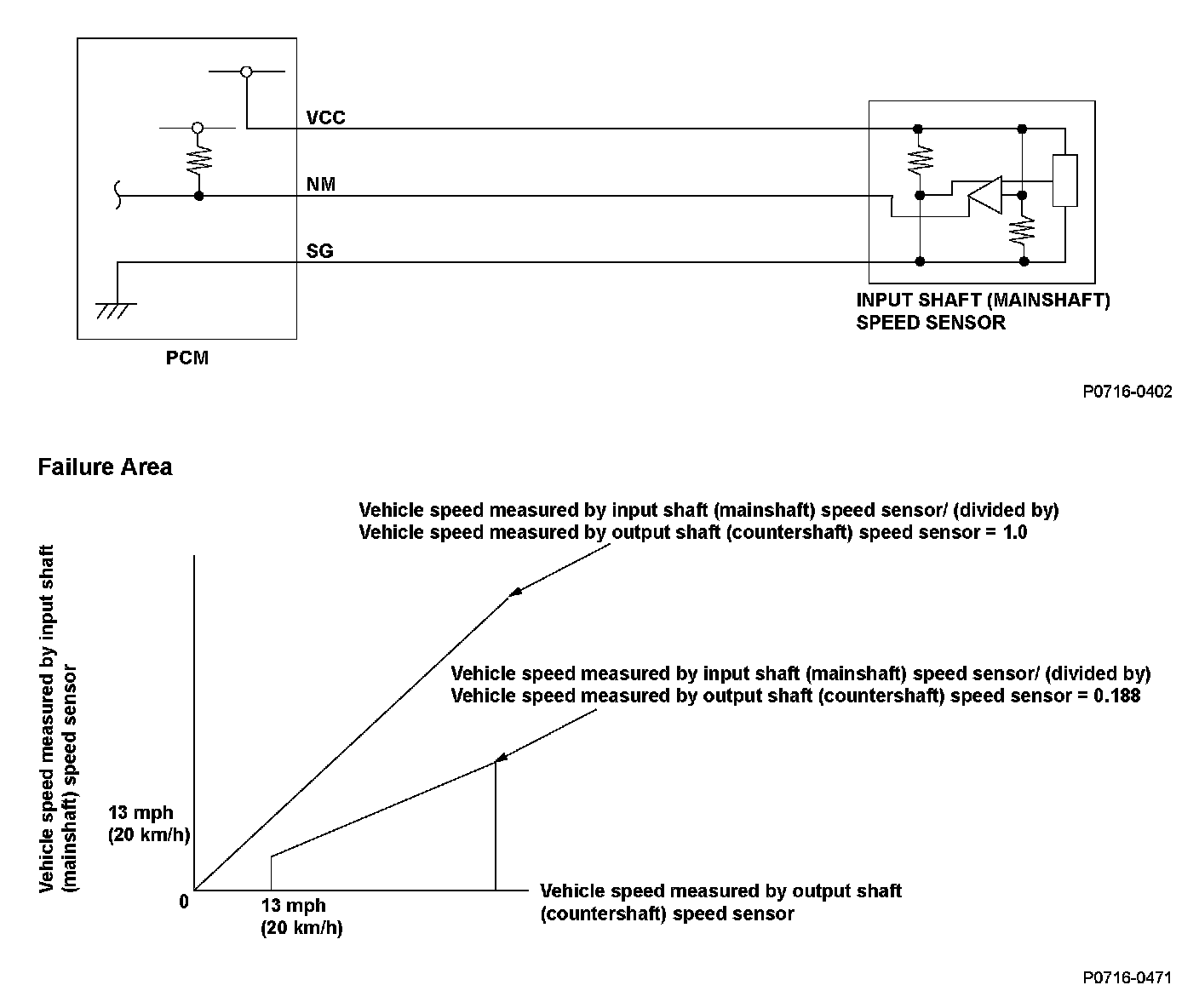 The input shaft (mainshaft) speed sensor is attached to the outside of the transmission housing. The input shaft (mainshaft) speed sensor generates a pulsing signal according to the speed of the input shaft (mainshaft) idler gear on the input shaft (mainshaft). Using that signal, the powertrain control module (PCM) determines the speed of the input shaft (mainshaft). If no pulses occur with the input shaft (mainshaft) rotating, the PCM detects a malfunction that may be caused by an open, a temporary open, or a short to ground. Based on the velocity ratio measured by the output shaft (countershaft) speed sensor and the input shaft (mainshaft) speed sensor, a malfunction is detected and a DTC is stored.