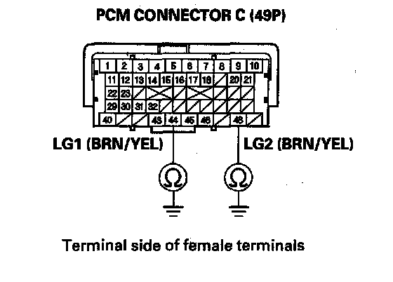 10. Check for continuity between PCM connector terminal C44 and body ground, and between terminal C48 and body ground.