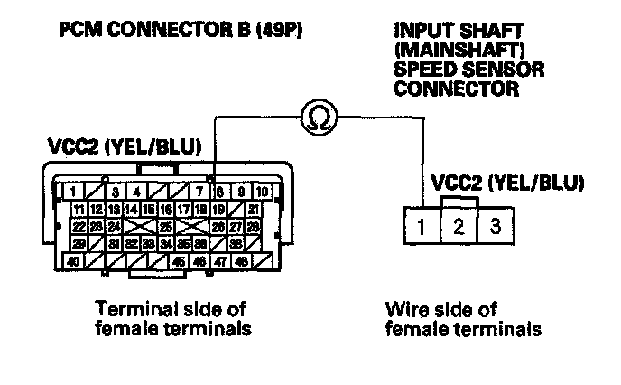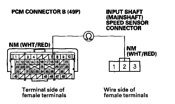 17. Check for continuity between PCM connector terminal B19 and input shaft (mainshaft) speed sensor connector terminal No. 1.