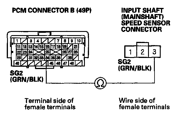 21. Check for continuity between PCM connector terminal B34 and input shaft (mainshaft) speed sensor connector terminal No. 3.