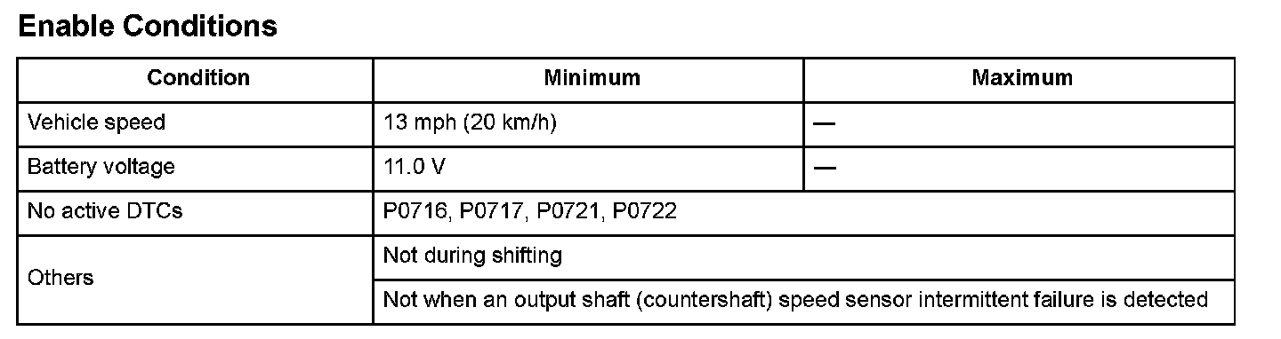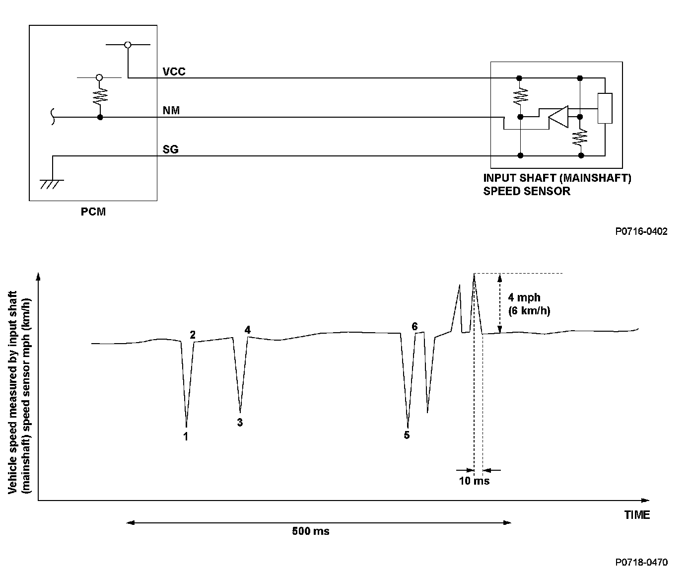 The input shaft (mainshaft) speed sensor is attached to the outside of the transmission housing. The input shaft (mainshaft) speed sensor generates a pulsing signal according to the speed of the input shaft (mainshaft) idler gear on the input shaft (mainshaft). Using that signal, the powertrain control module (PCM) determines the speed of the input shaft (mainshaft). If no pulses occur with the input shaft (mainshaft) rotating, the PCM detects a malfunction that may be caused by an open, a temporary open, or a short to ground. Based on the fluctuation of the vehicle speed measured by the input shaft (mainshaft) speed sensor, a malfunction is detected and a DTC is stored.