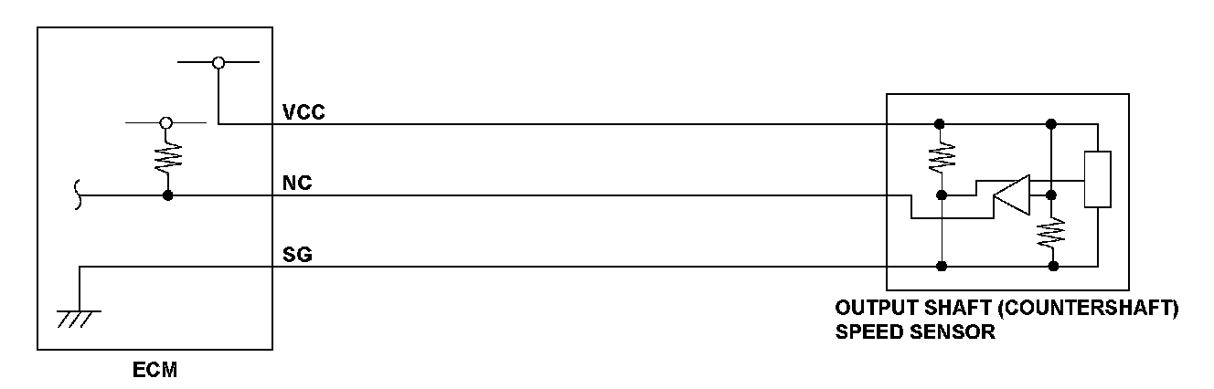 The output shaft (countershaft) speed sensor is attached to the transmission housing to sense output shaft (countershaft) revolutions. The engine control module (ECM) determines the vehicle speed according to the signal from the output shaft (countershaft) speed sensor to the control units. If no signal from the output shaft (countershaft) speed sensor is received for a set time, the ECM detects a malfunction and a DTC is stored.