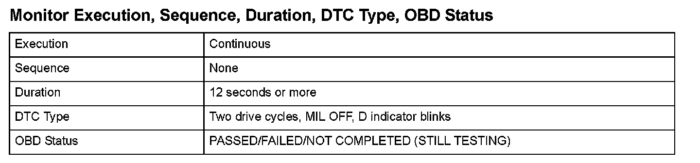 Monitor Execution, Sequence, Duration, DTC Type, OBD Status