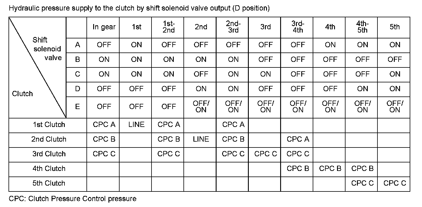 Hydraulic pressure to each clutch is controlled by the shift valve. The shift valve activates according to the ON/OFF status of shift solenoid valves A, B, C, D, and E. Hydraulic pressure supply in D is shown above. The line pressure or the clutch pressure control pressure (CPC A, CPC B, or CPC C) is supplied to each clutch by the shift valve activated. The powertrain control module (PCM) computes the actual ratio of mainshaft and countershaft revolutions. If a difference between the actual ratio and the commanded gear occurs when shifting to each gear position, a malfunction in A/T clutch pressure control solenoid valve B or the hydraulic system is detected and a DTC is stored.