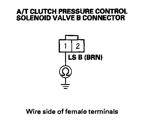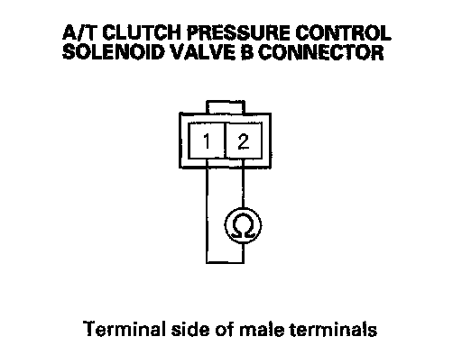 10. Measure the resistance between A/T clutch pressure control solenoid valve B connector terminals No. 1 and No. 2.