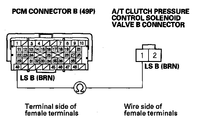 15. Check for continuity between A/T clutch pressure control solenoid valve B connector terminal No. 1 and PCM connector terminal B40.